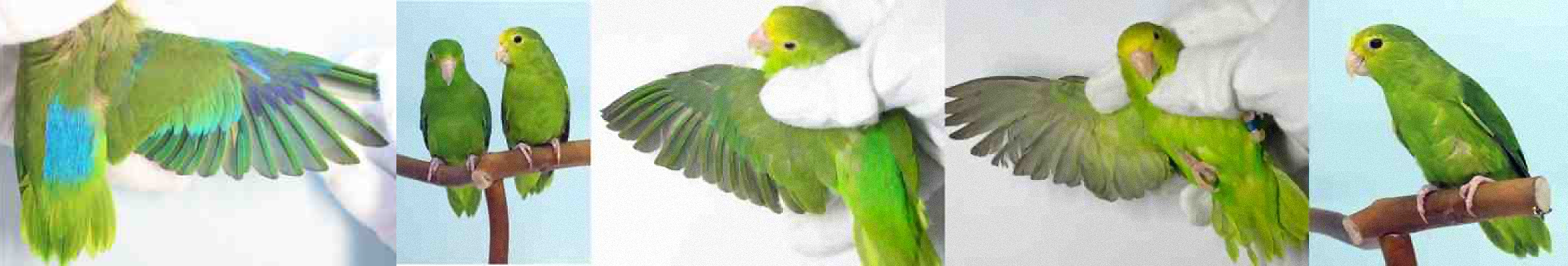 - Buitenste secundaire vleugel dekveren zijn lichtgroen in de punt overgaand naar hemelsblauw