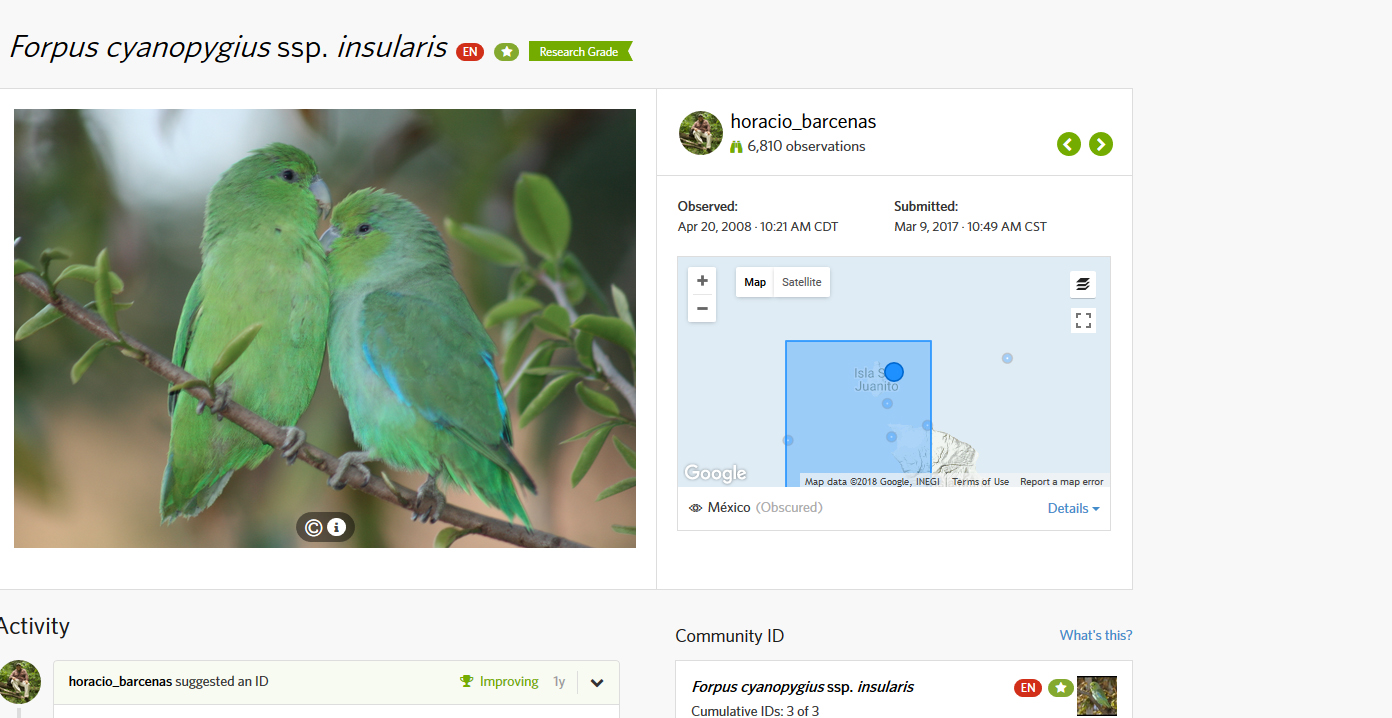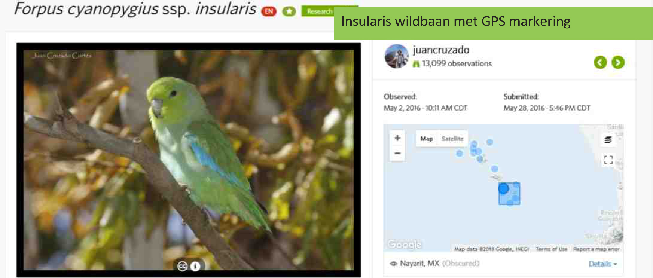 Het zal eind 2016 begin 2017 geweest zijn toen de eerste waarnemingen van de Forpus cyanopygius insularis gepubliceerd werden op het internet. Voor het eerst een duidelijke foto van de Insularis met een gps-aanduiding. Dit is natuurlijk helemaal geweldig!!! Door deze gps-aanduiding bij de foto’s nam voor ons de onzekerheid weg of het wel een insularis betrof. Met het inzoomen op de gps-gegevens komen we dan ook op de Tres Maria eilanden terecht. Mooier kon niet. EUREKA! We hebben de echte insularis “gevonden”. Vervolgens worden de eerste foto’s gepubliceerd in ons blad en wachten op reacties die komen gaan.