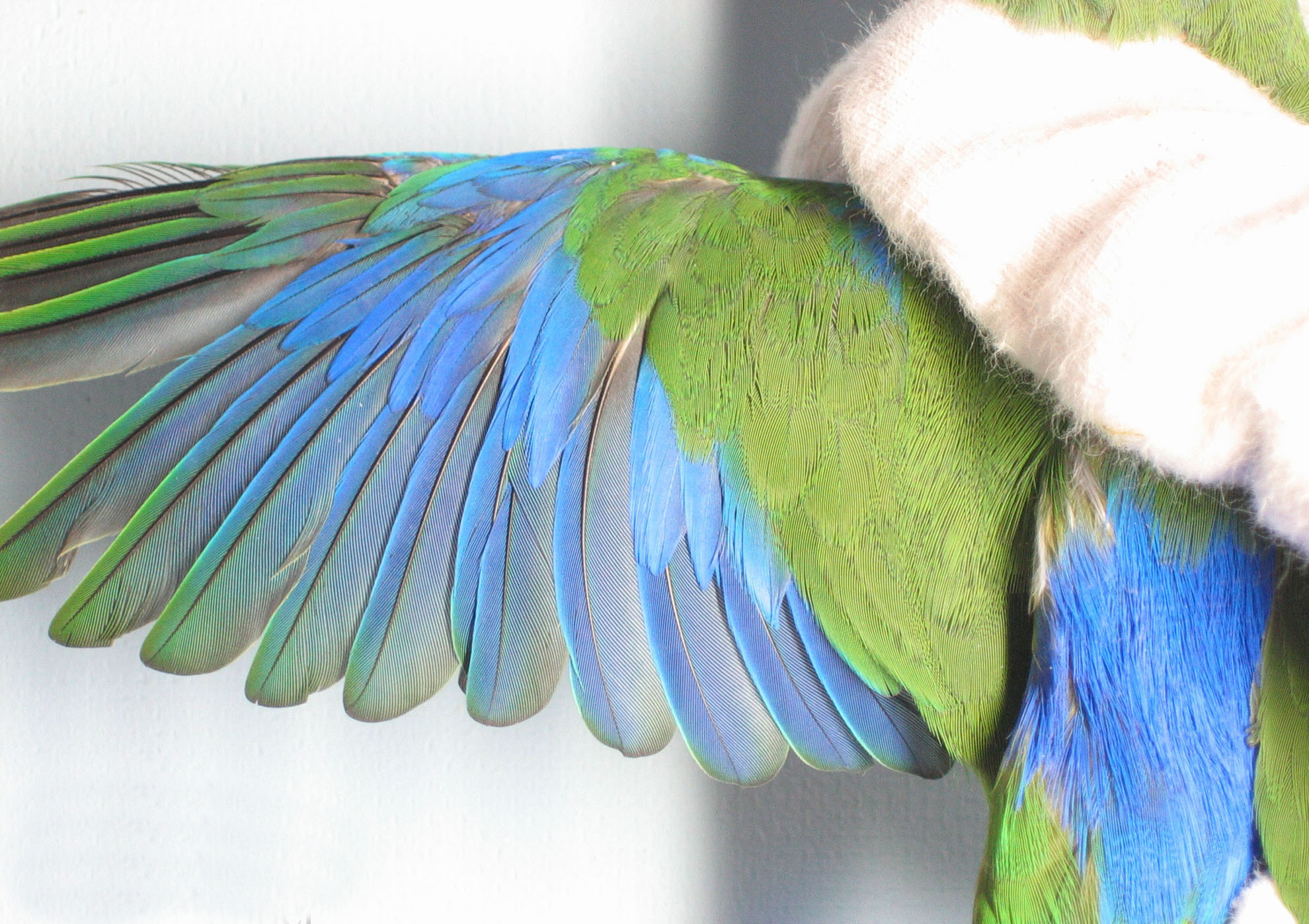 Foto ’s van de balg waarop heel duidelijk de blauwe waas en zwart/grijze snavel te zien is. Ook enkele foto ’s van levende Forpus cyanopygius insularis (afstammelingen uit de lijn van de heer Banning), het antwoord: None of these photo’s show the breastcolour!! So I cannot comment. Vrij vertaald: Geen van deze foto’s toont de borst kleur, hierdoor kan ik geen commentaar geven! Door dit antwoord en mede door de duidelijke foto ’s die er gestuurd zijn heb ik grote twijfels of mevr Low de Forpus cyanopygius insularis wel in het wild gezien heeft. In haar eerste mail kwam bij nader inzien de aap al uit de mouw. Hierin vertelde ze had zelf geen foto ’s althans geen duidelijke foto’s had van de Forpus cyanopygius insularis.