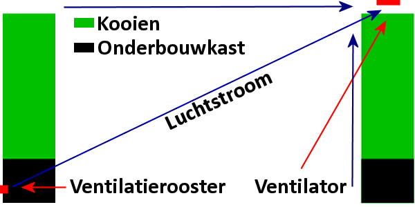 Dit is te realiseren door bijvoorbeeld de opbouw ventilator boven de kooien in het plafond te monteren en een onderbouw kast voor de muis werende roosters te zetten \ bouwen. Hierdoor zuigt de ventilator indirect, via de naden en kieren van de onderbouw kast, verse lucht aan waardoor er nooit een koude luchtstroom kan ontstaan. Bijkomend voordeel is dat we dan opvallend weinig last van (vogel)stof hebben en de luchtvochtigheid zelden hoeven bij te sturen. Op de onderstaande tekeningen kun je zien hoe het er dan ongeveer uit ziet.